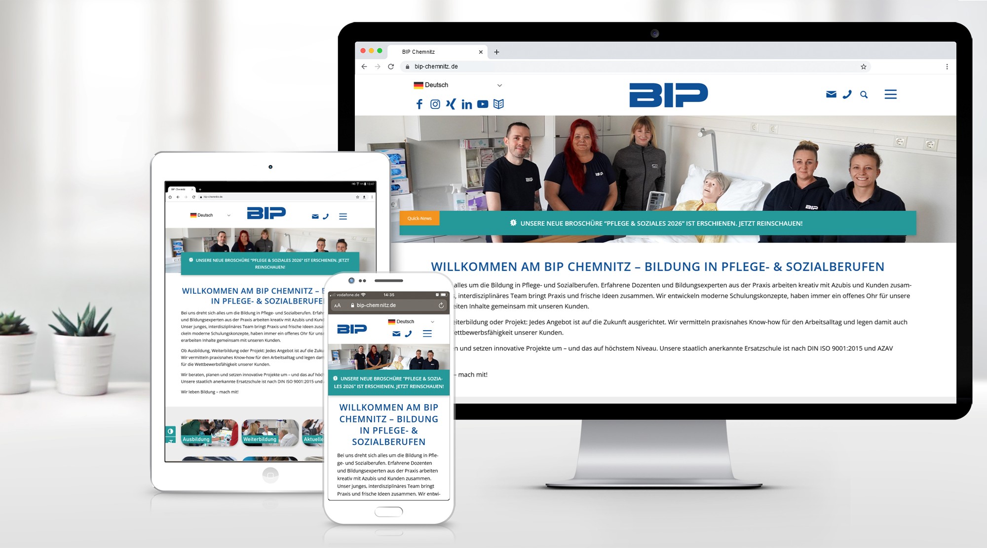 Der Unternehmensauftritt im Internet unterstützt die Kunden und angehenden Schüler bei der Wahl des passenden Bildungsangebotes innerhalb des umfassenden BIP-Portfolios. Um der breiten Zielgruppe der Berufsfachschule wichtige Informationen zum Einstieg und Inhalt der Ausbildungen auf kurzem Weg zu vermitteln, wurden Usability und Design intuitiv und zielgruppenoptimiert angepasst. Durch die moderne und übersichtliche Kacheloptik gelangen Nutzer in maximal zwei Klicks zum gewünschten Ziel – natürlich funktioniert das auch über mobile Endgeräte wie Smartphones oder Tablets.