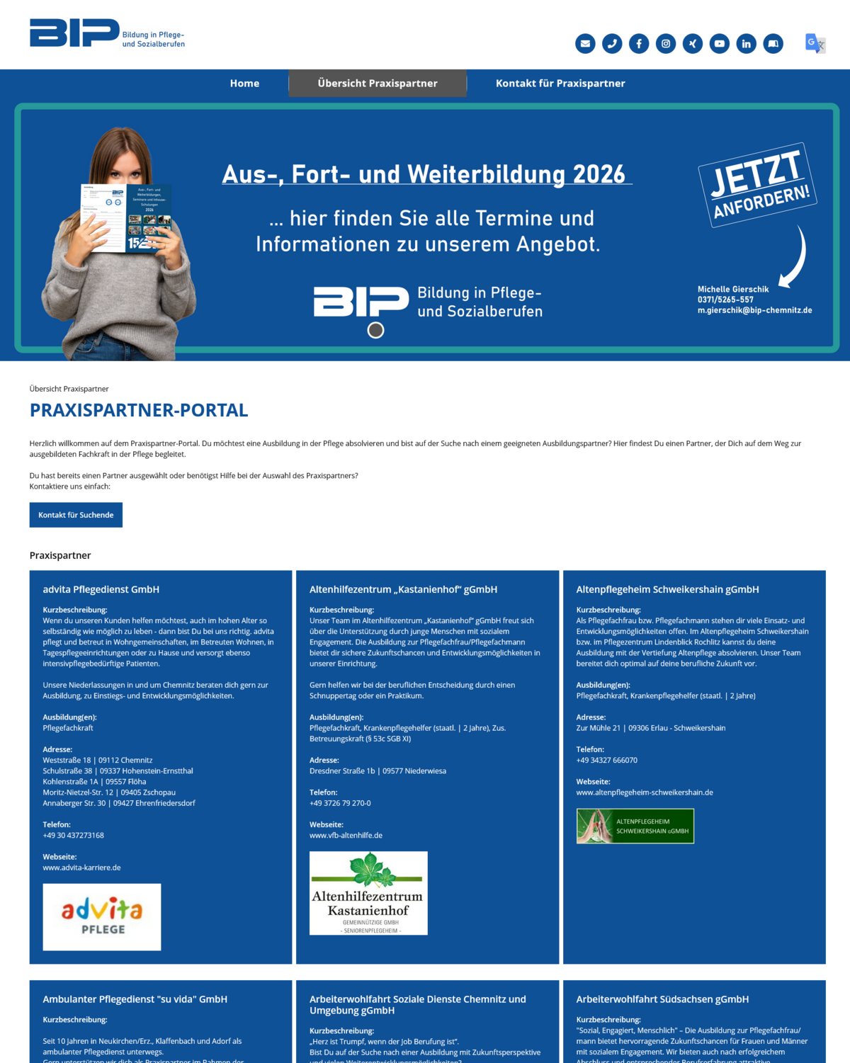 Das gilt z. B. auch für ein Praxispartner-Portal, das P3N MARKETING vor 2 Jahren für die BIP Chemnitz gGmbH – Berufsfachschule für Pflege- und Sozialberufe – umgesetzt hat. Ziel des Portals ist der Dialog zum Finden von Ausbildungsangeboten zwischen Pflegeeinrichtungen und potentiellen Auszubildenden.